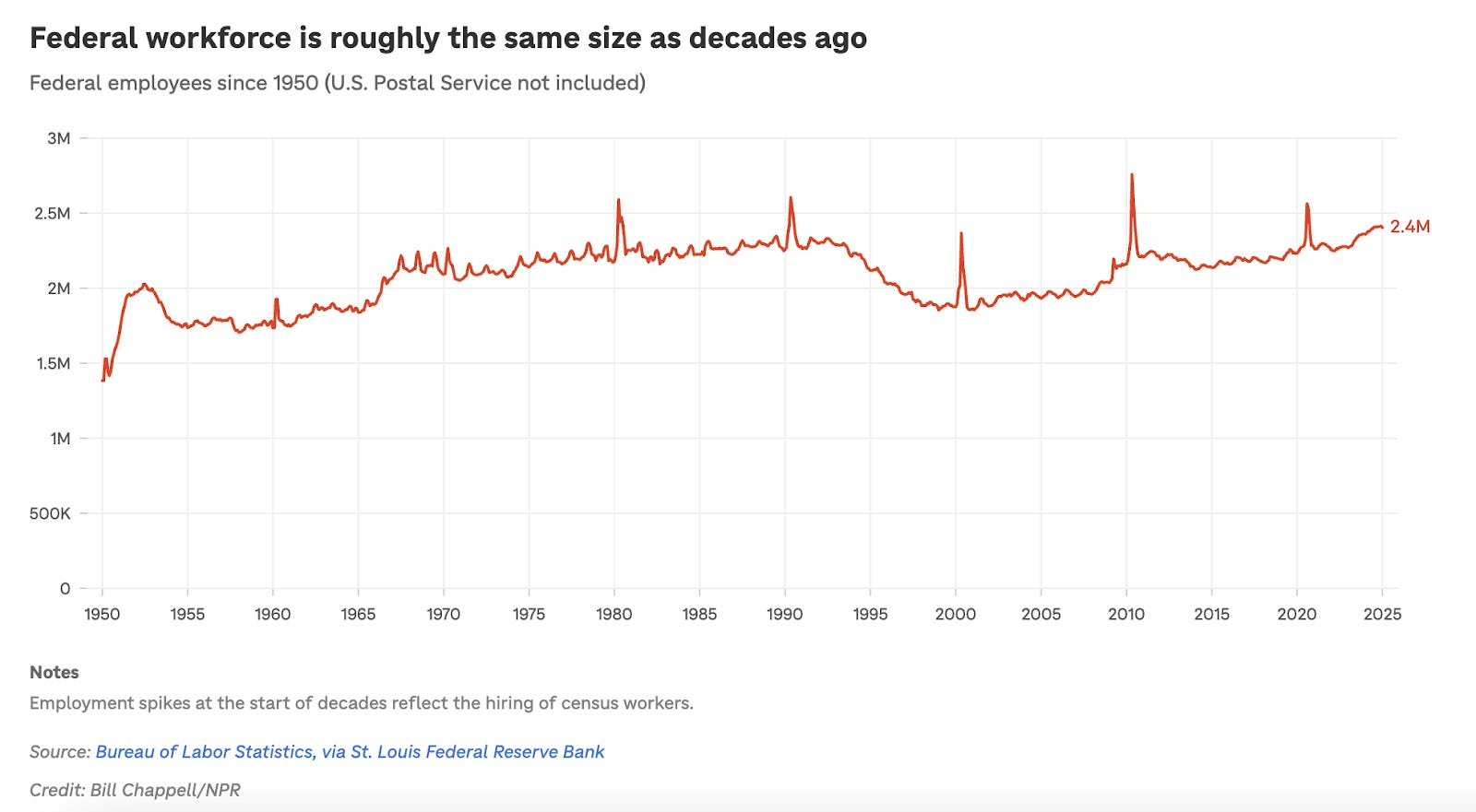 The Federal workforce remains roughly the same size as in the 1960s despite the US population doubling. Military and veterans' affairs represent 60% of this workforce, while the Department of Education (a frequent target) comprises just 0.2%, primarily administering programs like Pell Grants. With 80% of Federal employees working outside Washington DC, these cuts create economic ripples nationwide.