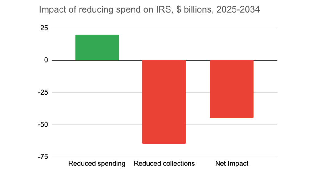 The CBO estimates that cutting $20 billion in IRS investment would reduce revenue collection by $65 billion: $45 billion net loss.