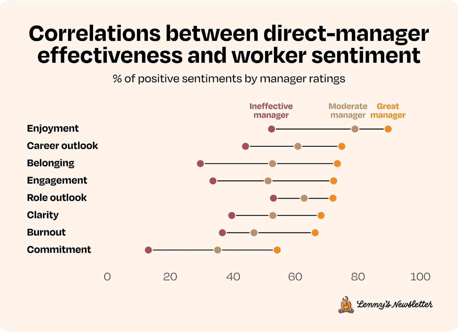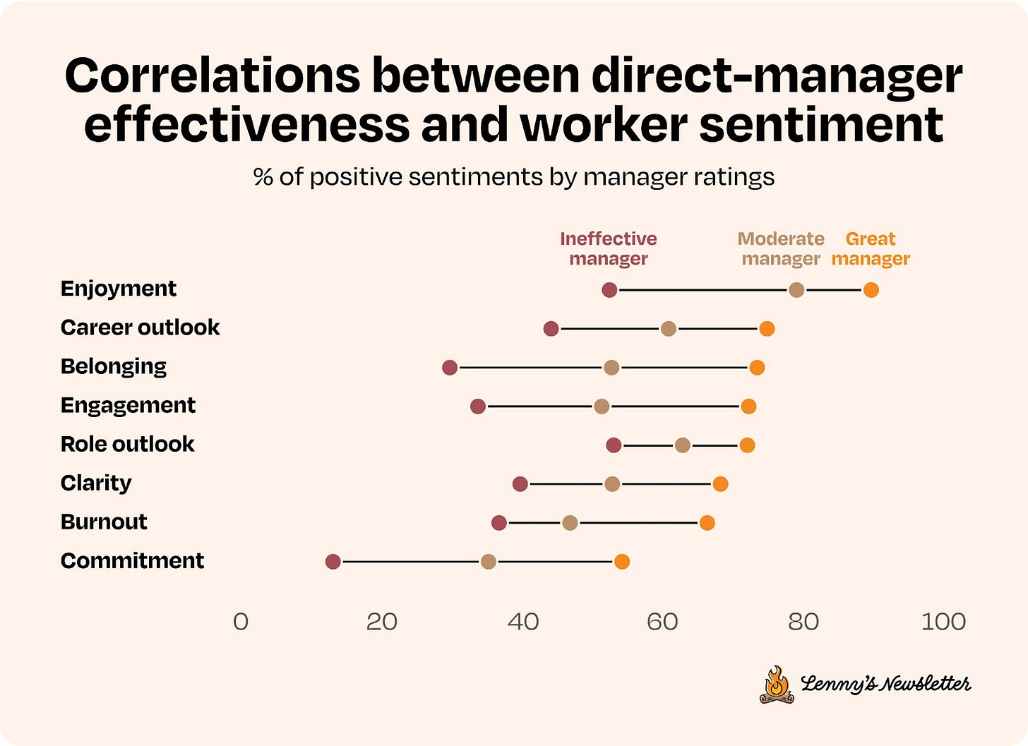 The gaps between great managers and ineffective managers aren't the small deltas in workplace flexibility covered above—they're a chasm. Great managers make a huge difference on nearly every aspect of people's outlook, and even having moderate managers ("my manager doesn't suck") is a sizable win.