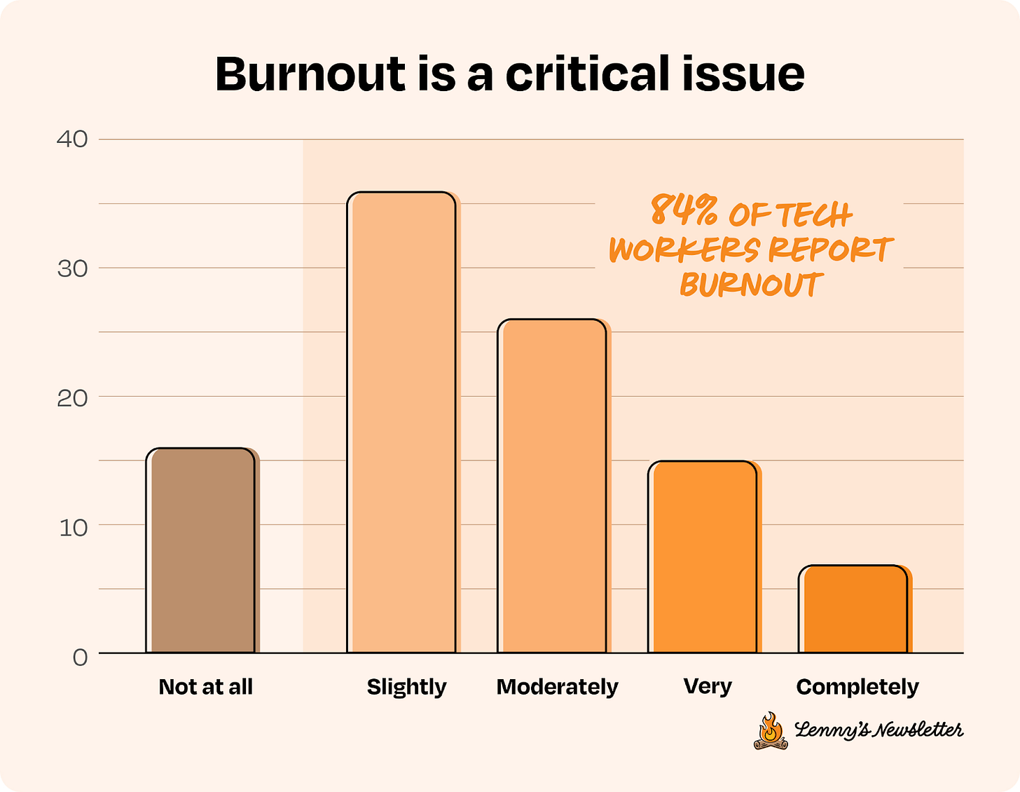 Much worse: 84% of tech workers report burnout, and 45% are currently experiencing significant burnout. Which sounds bad because it is bad. What's at fault? It's not because of robots—it's because of humans. Specifically, the humans leading and managing them.