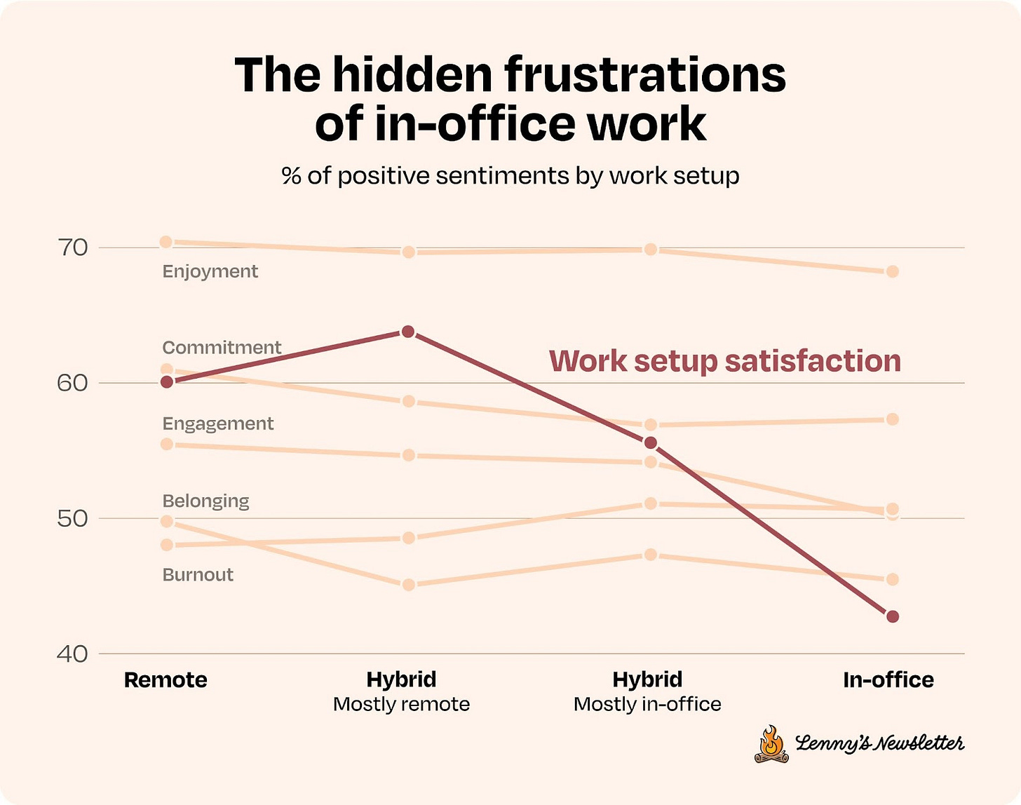 Hybrid but mostly remote does quite well. Folks who are mostly in-office look a lot like fully in-office, but the 5-days-a-week crew still scores lowest overall.