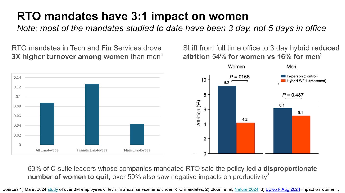 But this bias has real consequences: recent research shows women are up to 3X more likely than men to leave when faced with return-to-office mandates.