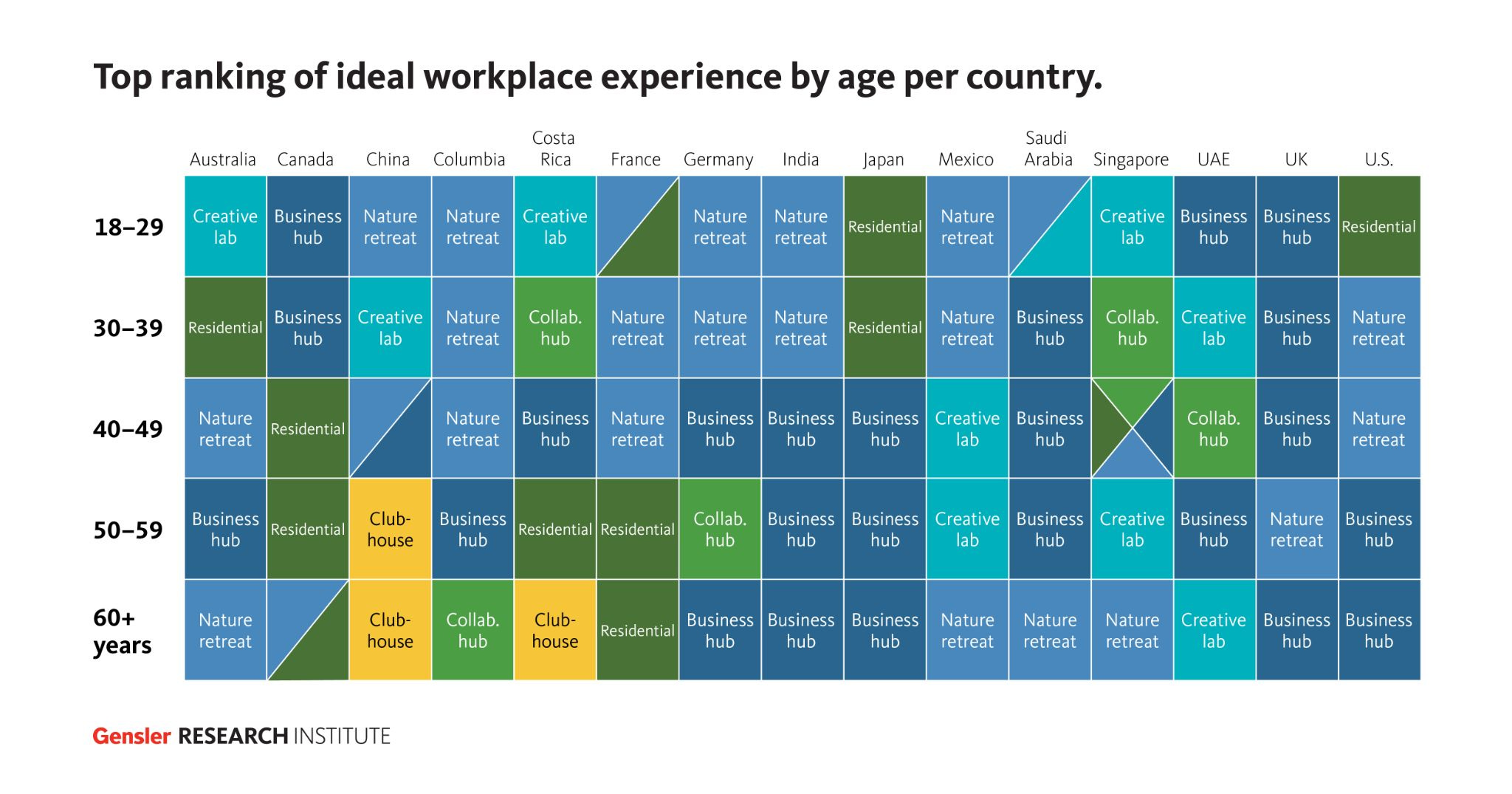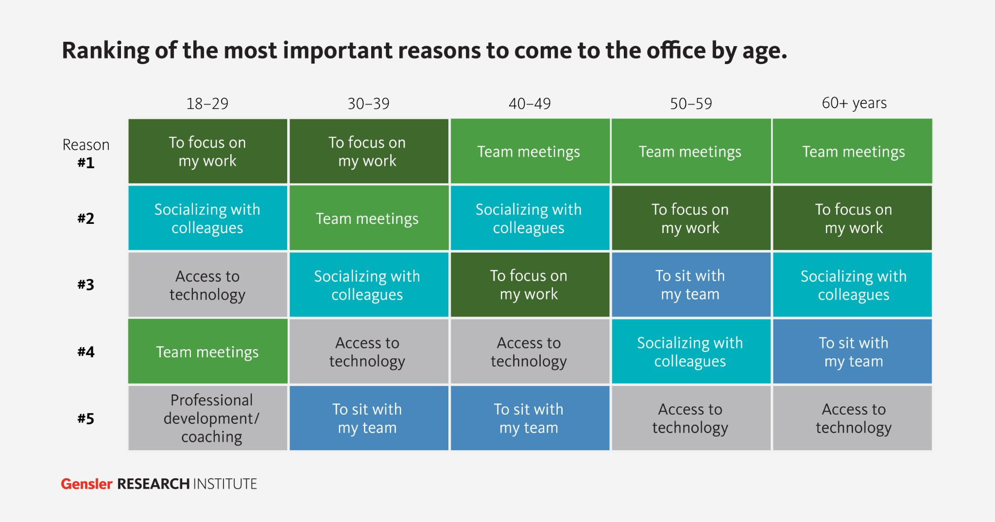 Gensler's research debunks this myth. When they analyzed responses by age groups across 16 countries, the top reasons for coming to the office were strikingly consistent: